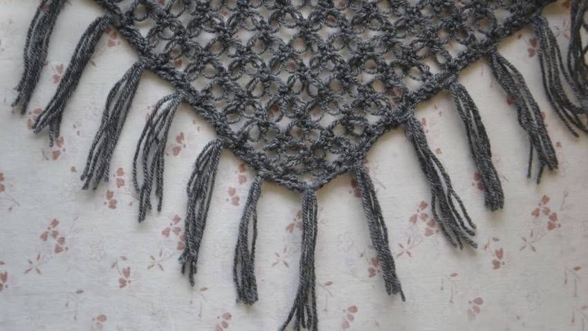 Вязание этой шали следует начать с середины верхнего края со скользящей петли. Всего необходимо связать 34 ряда, при этом нужно расширять полотно по центральной линии и верхней стороне. После этого необходимо обвязать верхний край шали. Нить не обрываем и делаем 111 арок из трех воздушных петель. Во втором ряду обвязки присутствуют наклонные шишечки.Шаль «Цветочная сеточка». Для вязания понадобятся: