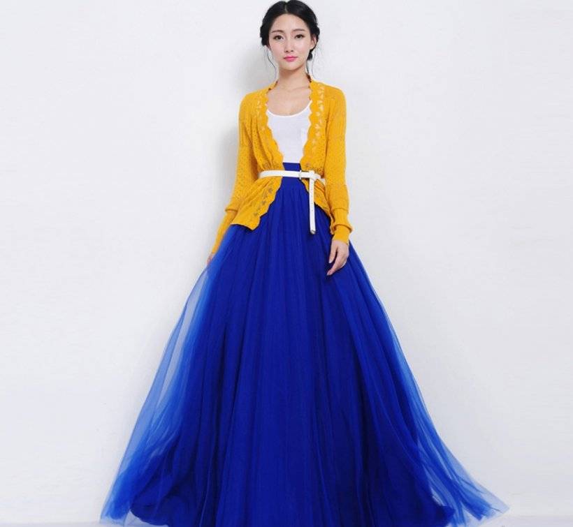 Юбки в пол выглядят нарядно и торжественно, поэтому часто используются в качестве свадебных или балльных моделей. Модели в пол можно смело назвать универсальными, ведь они подходят всем девушкам без исключения. Если надеть длинную юбку из органзы с блузой из шёлка или шифона, можно смело отправляться на вечеринку. В сочетании с пуловером из трикотажа можно создать стильный образ на каждый день. Любительницы стиля гранж могут комбинировать юбку в пол с обыкновенной майкой.