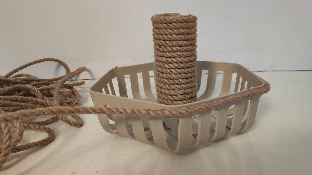 Задекорируйте кусок трубы веревкой, закрепив ее горячим клеем. Обклейте край тарелок шпагатом. В качестве декора вы можете использовать любые другие материалы в зависимости от дизайна кухни и личных предпочтений.