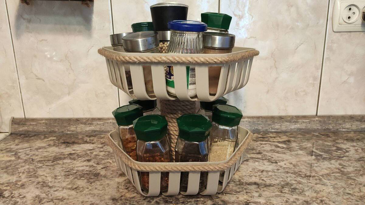Когда клей высохнет, заполните подставку баночками. Теперь, вращая конструкцию в разные стороны, вы сможете быстро найти нужную специю.
