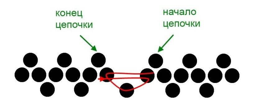 - После выполнения основной цепочки замыкания ее в круг, к ней прикрепляется еще одна, точно такая же. Она приплетается к верхнему ряду готовой цепочки, что также хорошо видно на схеме.