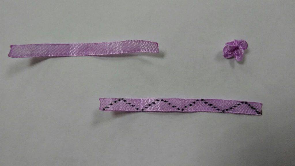 - ленточку светлого оттенка сирени шириной 7 мм нарезают на отрезки по 80 мм;