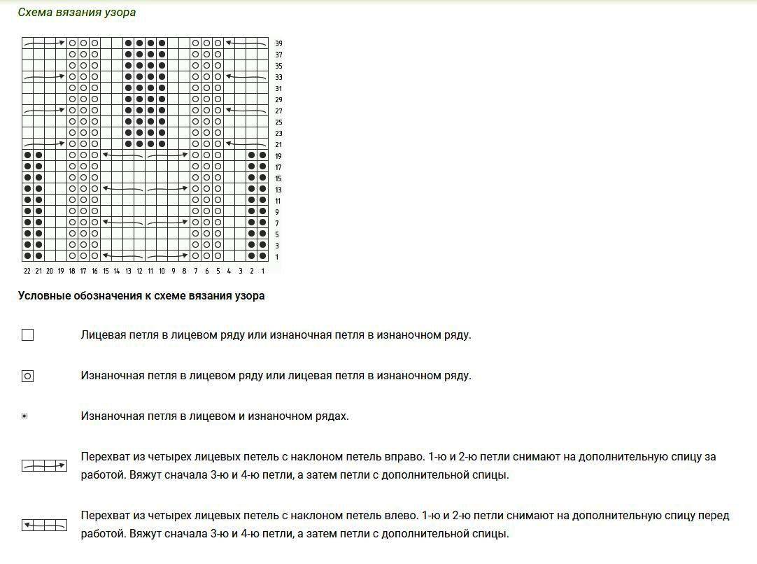 - 3р.: *2 изнан., 2 лицев., 5-ую и 6-ую петли снять на вспом. сп. за полотном, 2 лицев., 2 лицев. со вспом. сп., 2 лицев.*, 2 изнан.;