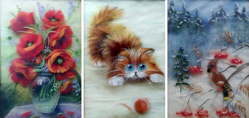 Мокрое валяние. Мокрое валяние из шерсти – это особый вид рукоделия, который позволяет создавать картины, украшения (браслеты, серьги, заколки, ожерелье), обувь (тапочки, пинетки, сандалии, валенки), аксессуары (сумочки, клатчи, кошельки, брошь, шарфы, шапки), игрушки, сувениры (магниты, брелоки). Данный вид творчества подходит даже для тех, кто не обладает художественными способностями.