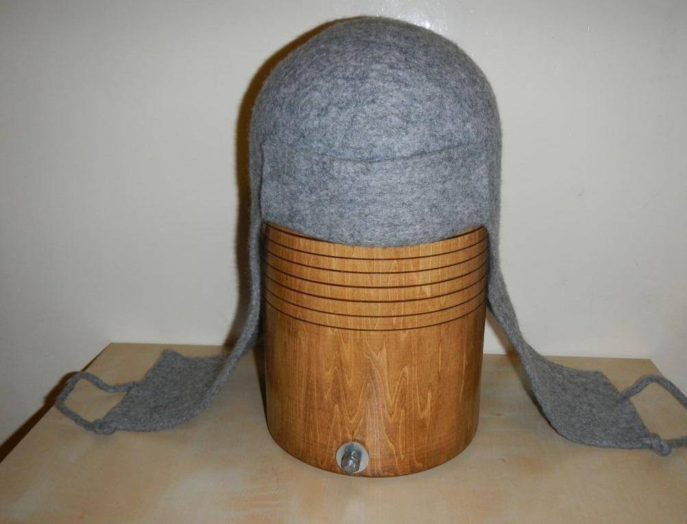 Изделие отжимается, разглаживается, надевается на болванку. Закрепляется отворот. Формируется макушка, можно пройти наметочным швом. Высохнув, войлок запомнит требуемую форму и сохранит ее после удаления ниток. На следующий день головной убор будет готов!
