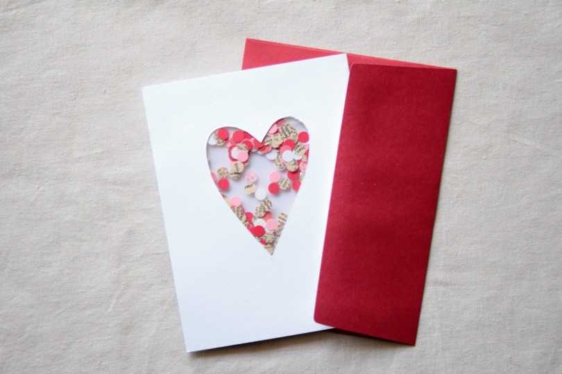 Ну а саму открытку делать легко: возьмите основу из любого цвета бумаги, согните пополам. Далее из другого листа бумаги вырежьте сердце и приложите к презенту. При помощи штампа заполняем форму, даем высохнуть, внутри пишем признания.