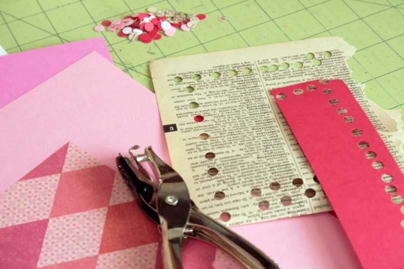 Помимо венка, можно сделать ещё и гирлянды с сердечками. На помощь придёт фигурный дырокол с сердцем и обычный дырокол для прокалывания круглых отверстий.
