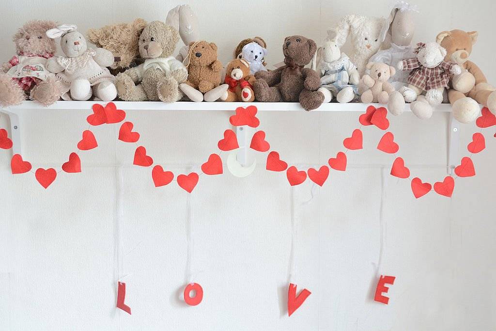 Кто из нас в детстве не делал цепочку из небольших бумажных звеньев для новогодней елки? Небольшие отрезки бумаги разных цветов сгибались овалом, один конец продевался в готовое звено и края приклеивались, замыкая цепочку. Следующий вариант декоративной гирлянды изготавливается аналогично, только каждое звено сделано в форме сердечка.