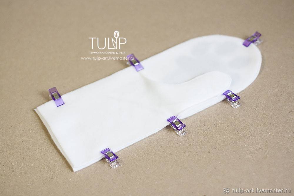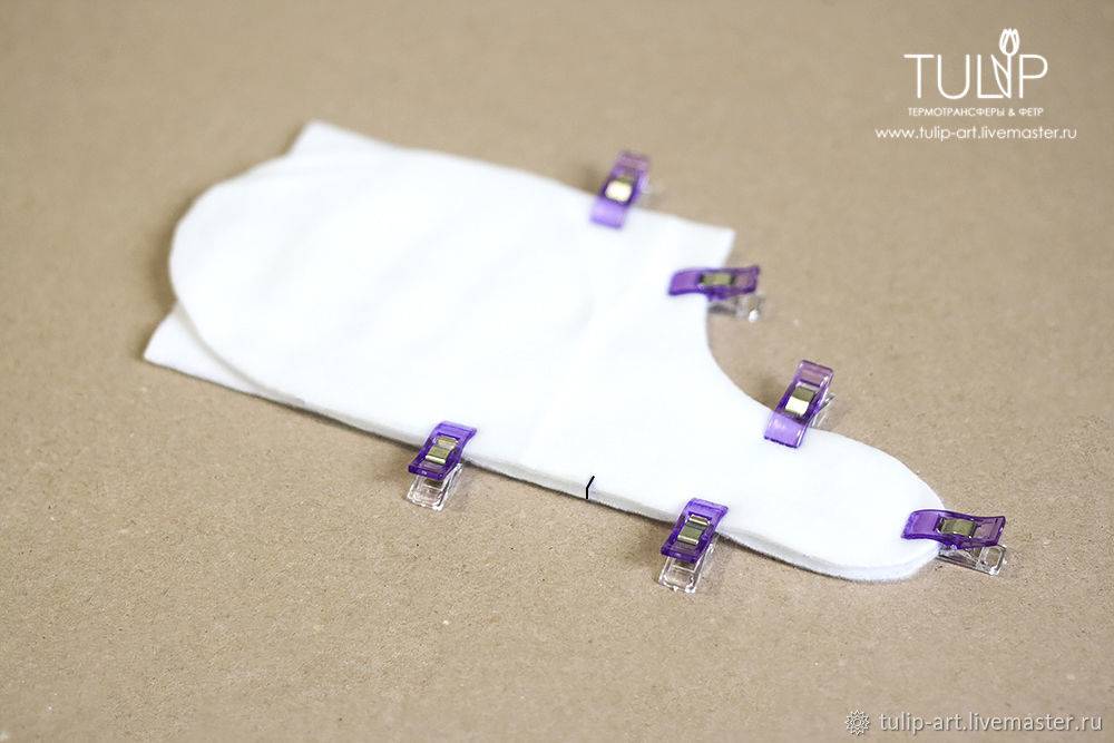 Шаблон аккуратно вырезается с помощью ножниц. С изнаночной стороны рекомендуется разметить итоговое расположение шва. После разметки оба компонента одной варежки скалываются английскими булавками. Затем можно приступать к работе на швейной машинке. Для пошива подойдёт обычная строчка с минимальным шагом. Булавки следует удалять по мере прошивания.
