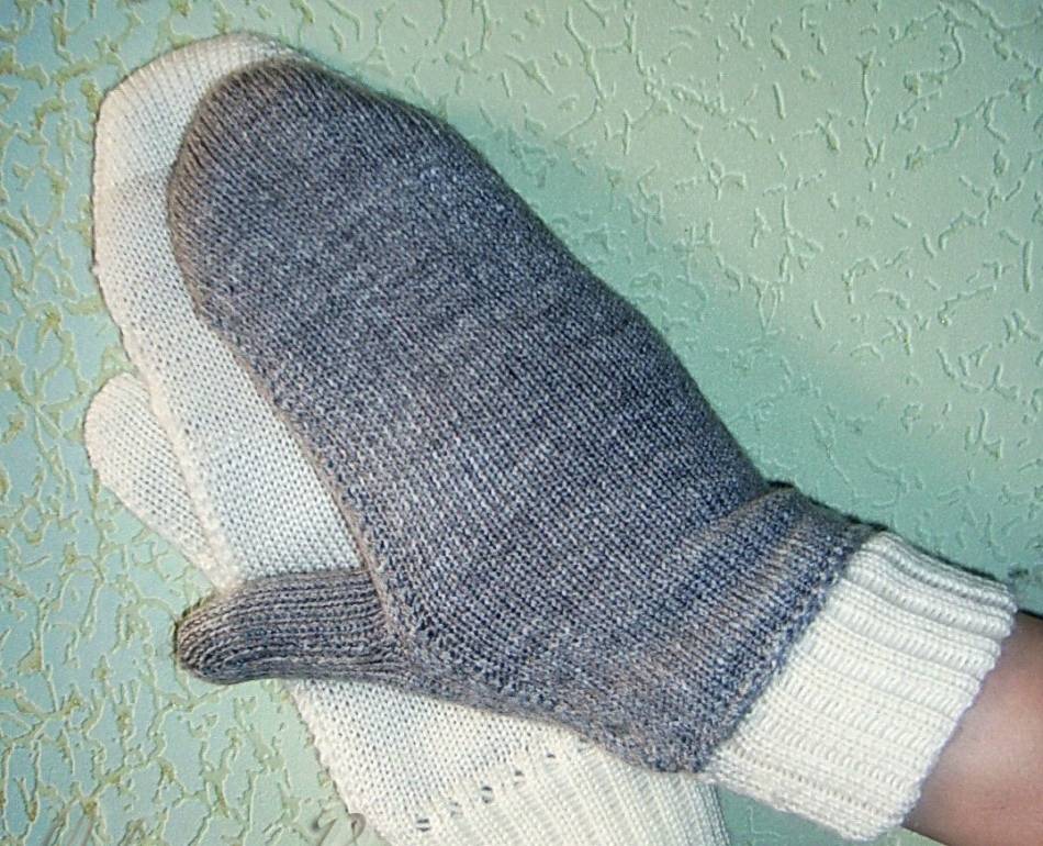 - вяжите внутреннюю варежку лицевой гладью в зеркальном отображении от внешней. То есть большой палец располагайте по той же стороне.