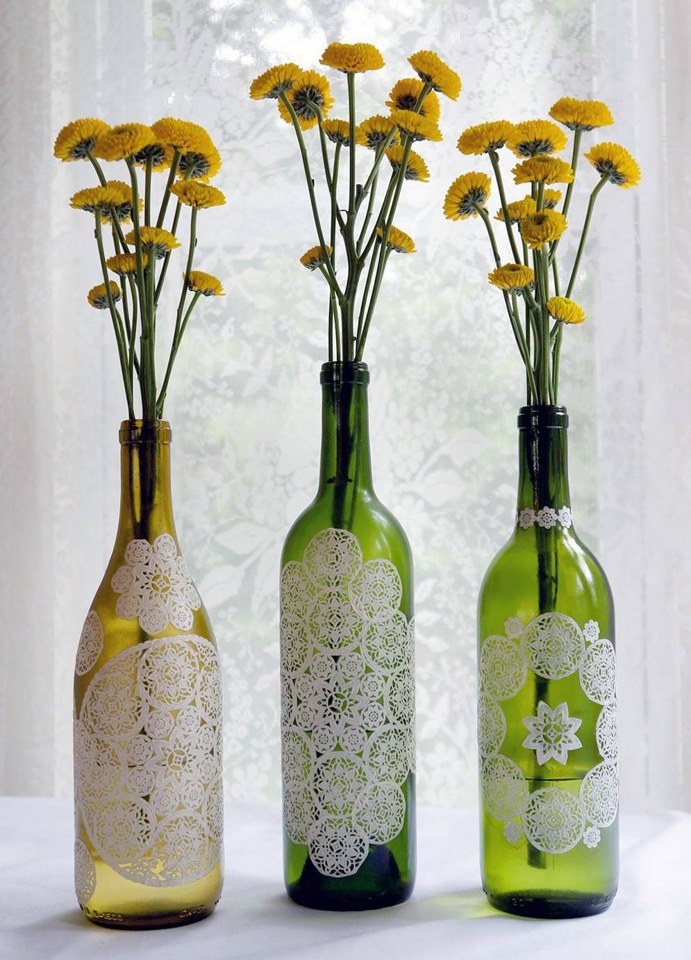 Работать со спрей-краской лучше всего вне помещения или только в том случае, если помещение хорошо проветривается. Ждем полного высыхания краски. Вазу можно украсить отрезками гипюра или кружева.