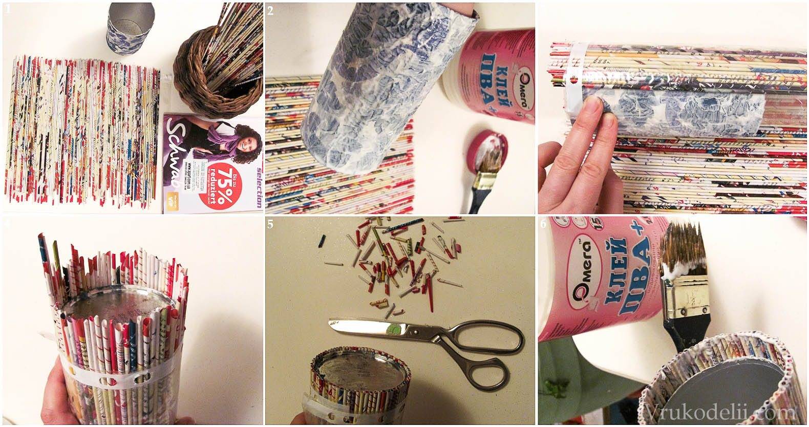 Теперь начинается самая трудоемкая работа – создание украшений для вазы из бумаги. Нарежьте старые газеты на полоски, сложите полоски пополам и скрутите их в рулончики. Кончики бумаги закрепляйте супер-клеем или клеем ПВА. Приклейте готовые украшения к поверхность картонной трубы с помощью клея ПВА, плотно располагая друг к другу.