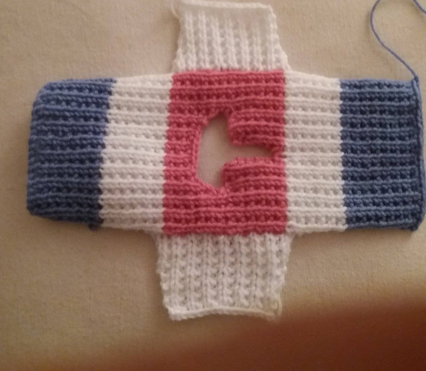 В полочках, чтобы сформировать горловину на высоте семнадцати сантиметров, в каждом втором рядке закрыть петлицы так: единожды пять петлиц, дважды по две и два раза по одной. И когда достигнем длины спинки, закрываем все петлицы. При этом на правой полочке, как и в ползунках, делаем три отверстия для пуговичек. Схемы очень простые, с этим может справиться даже начинающая рукодельница. Далее делаем плечевые швы, с помощью которых набираем тринадцать петлиц и начинаем вязать рукава платочной вязкой одним цветом шесть сантиметров, а потом меняем цвет и провязываем снова шесть сантиметров, после закрываем петельки. Второй рукавчик свяжем так же, как и первый. Сшиваем боковые швы, и вот наш комплект готов.