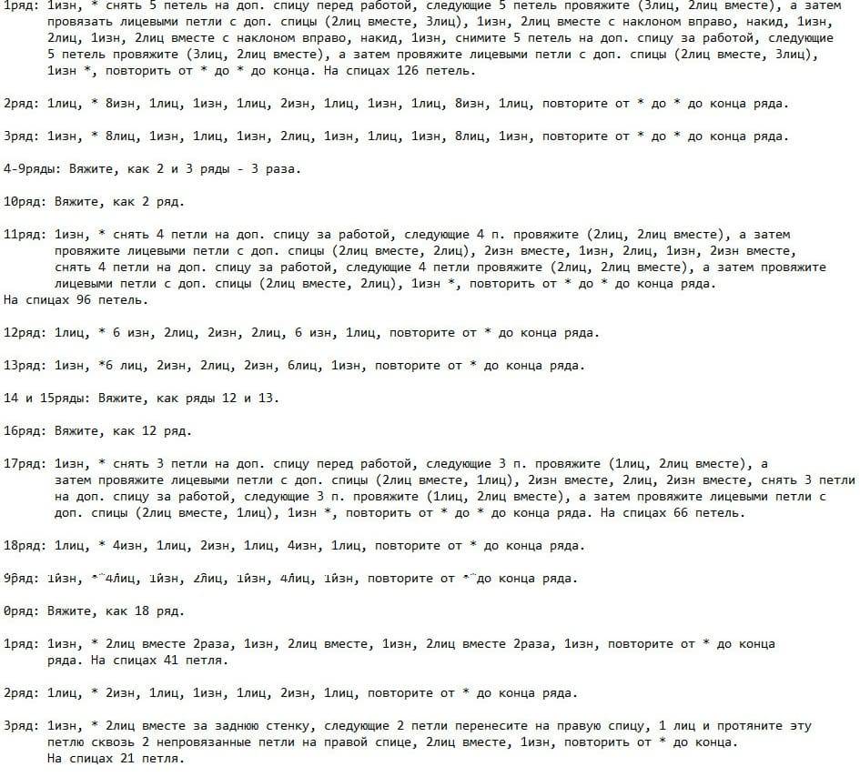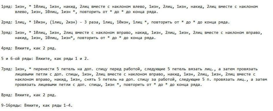 1р. *изн, 2 лиц, 2 изн, (2 лиц, изн, 2лвнп, нак, изн) — два раза, 2 лиц, 2 изн, 2 лиц, изн*, повторить от * до *четыре раза. 2р. *лиц, 2 изн, 2 лиц, (2 изн, лиц) — четыре раза, 2 изн, 2 лиц , 2 изн, лиц*, повторить от * до *четыре раза. 3р. *изн, 2 лиц, 2 изн, (2 лиц, изн, нак, 2лвнв, изн ) — два раза, 2 лиц, 2 изн, 2 лиц, изн*, повторить от * до * четыре раза. 4р. Вязать как 2р.