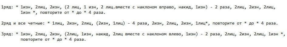 1ряд: *1изн., 2лиц., 2изн. **2лиц, 1изн., 2лиц.вместе наклон вправо,накид, 1изн.** — от ** до ** повторить 2 раза, 2лиц., 2изн., 2лиц., 1изн.*. повторяем ** 4 раза.