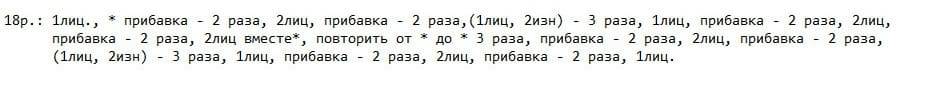 18ряд: 1лиц., *прибавка (1изн = 2изн.) – 2 раза, 2лиц., 2 прибавки, **1лиц., 2изн.**, повторяем от ** до ** 3 раза, 1лиц., 2прибавки, 2лиц., 2 прибавки, 2лиц.вместе*. от * до * повторим 3 раза, 2 прибавки, 2 лиц.,2 прибавки, **1лиц., 2изн.**, повторяем от ** до ** 3 раза, 1лиц., 2 прибавки, 2лиц. ,2 прибавки, 1лиц.
