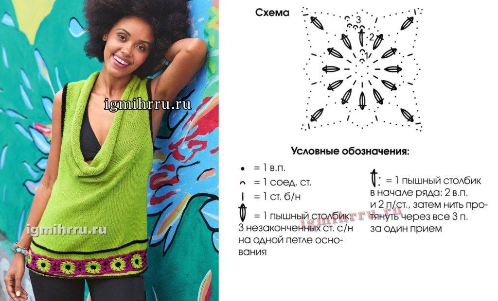 Сочетая однотонные и цветные квадратные мотивы крючком, мастерицы быстро вяжут модные вещи с простейшей схемой: