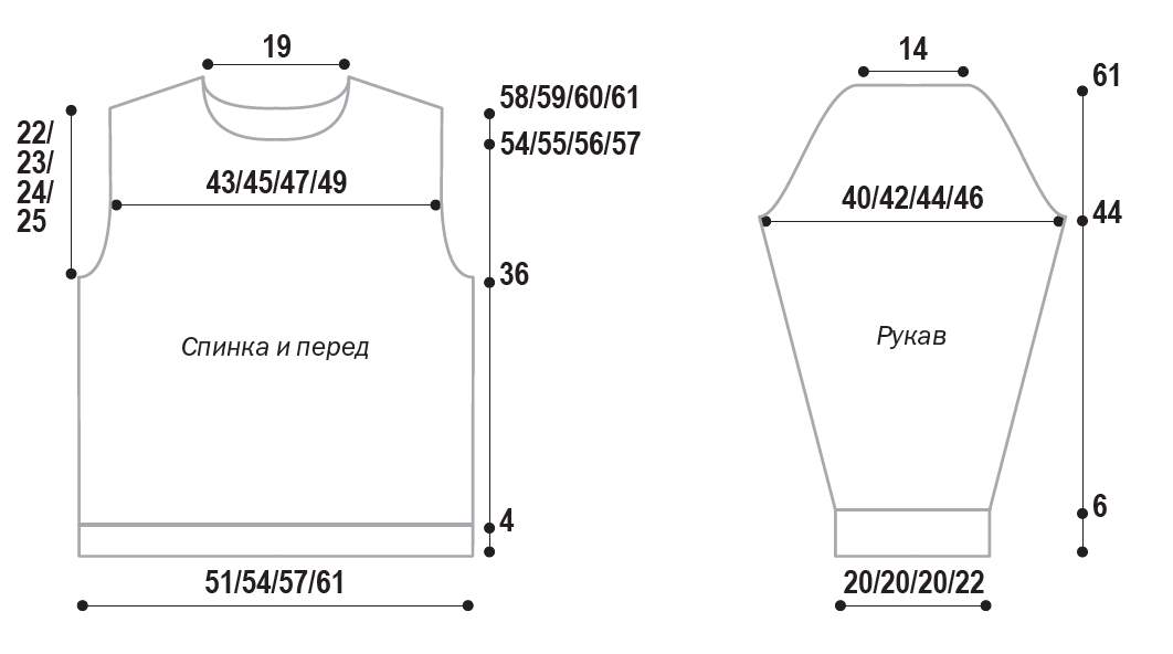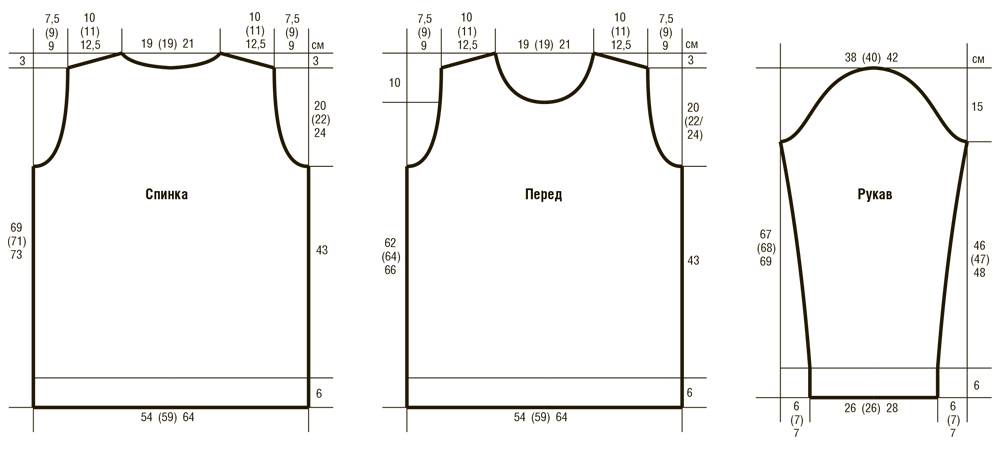 Пройма: на высоте 44 (43, 42, 40) см от наборного края (измерять на весу) закрыть с обеих сторон 1 (1, 1, 2) раз 2 петли и убавить 3 (8, 8, 11) раз 1 петлю, всего 86 (86, 94, 94) петли.