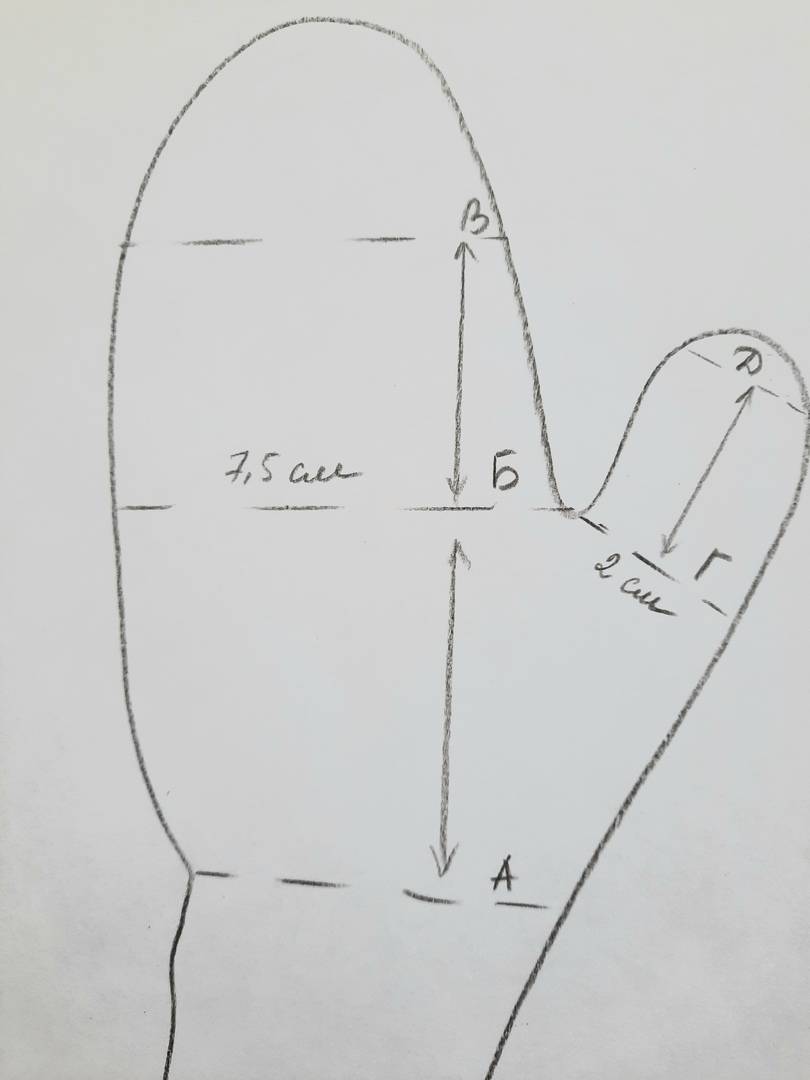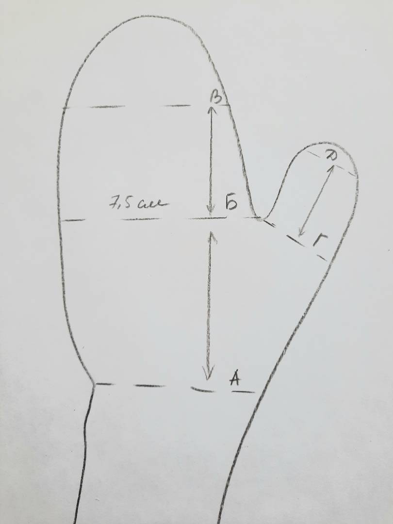 Затем необходимо сделать разметку. Для этого следует на рисунке отметить вспомогательные линии. Линия А -конец манжеты и начало вязания основного тела варежки, Линия Б — начало отделения большого пальца от основного тела, Линия В — кончик мизинца и начало убавок для формирвоания мыска, Линия Г — начало большого пальца Линия Д — начало убавок для большого пальца