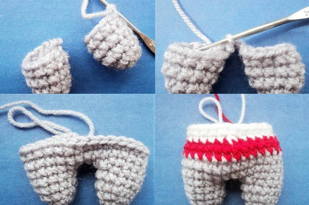 8. для первой ноги вяжем укороченный ряд – 7 сбн (9), для второй ноги вяжем удлинённый ряд — 12 сбн (9), далее на второй ноге делаем цепочку из 3 в.п. и соединяем с первой ногой с.п.