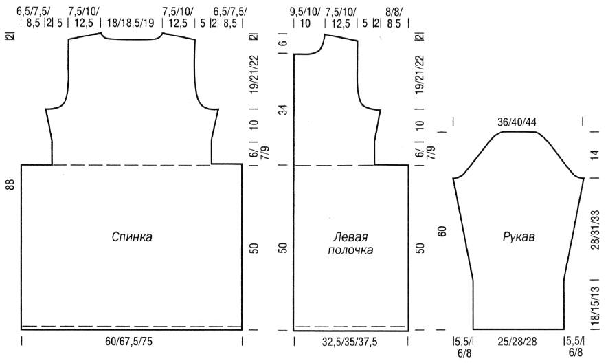 набрать 98 (110/122) п., связать 1 изн. р. лиц., 2 р. лиц. гладью. далее вязать узором А. Через 50 см выполнить 2 р. лиц. гладью, равномерно убавив в 1-м р. 22 (25/28) п. = 76 (85/94) п. Далее вязать узором В. Через 59 (57/56) см для боковых скосов прибавить с обеих сторон 1 х 1 п. и в каждом 8-м р. 2 х 1 п. = 82 (91/100) п. Через 69 (67/66) см для пройм закрыть с обеих сторон 1×4 п., в каждом 2-м р. 1 х 3 п., 1 х 2 п., 3 х 1 п. = 58 (67/76) п. Через 88 см для плечевых скосов закрыть с обеих сторон 1×5 (7/7) п.. в каждом 2-м р. 2 х 5 (6/8) п. Одновременно с 1-м убавлением для плеча закрыть для выреза горловины средние 22 (23/24) п. и вязать далее раздельно, закрыв по краям выреза во 2-м р. 1 х 3 п.