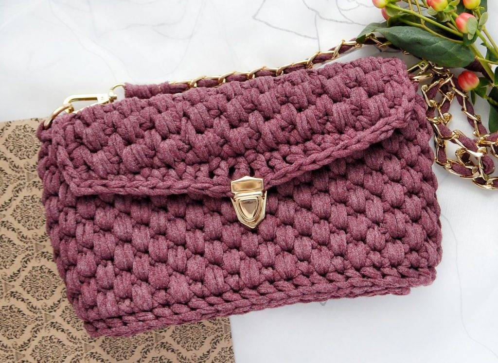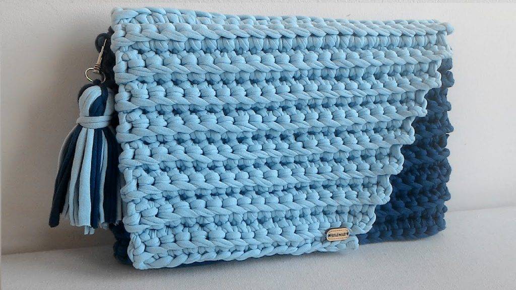 - Клатч (маленькая сумочка без ручек или длинным ремешком). Его можно связать крючком из трикотажной пряжи.