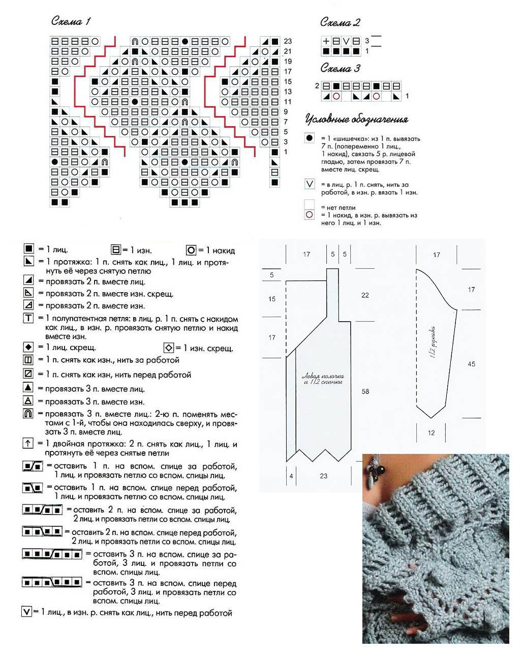 - Ключевой рисунок вывязывайте по схеме 1. В изнаночном полотне петли провязывайте по схематической таблице, накиды делайте с изнанки