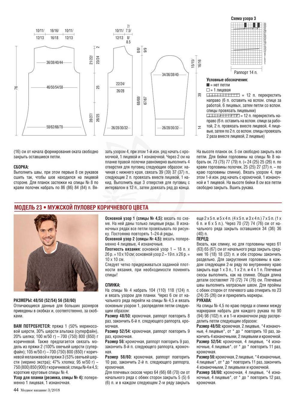 Для мужского белого джемпера понадобится пряжа 20 клубков, спицы простые и круглые, иголка для сшивания деталей. Добавление и сокращение петель обозначаются, например «1×3х2». Это объясняется как «1 раз 3 петли в каждом 2 ряду».