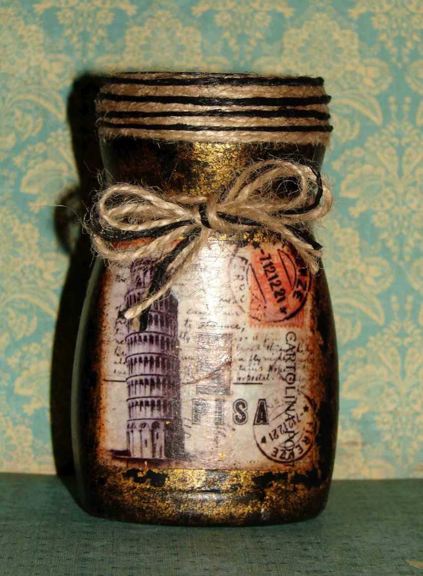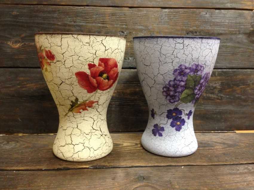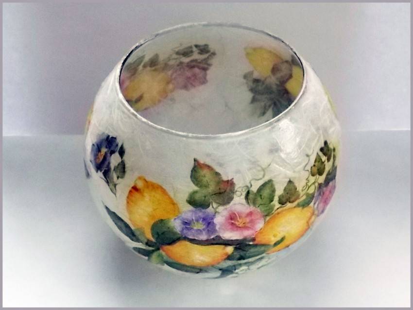 Если вы решили сделать вазочку в стиле Шебби-шик, то выбирайте рисунки с цветами в пастельных тонах. Краска вам потребуется такого же неяркого колера. Для застаривания можно применить битумную затирку, кракелюр двухфазный, крепкий кофе. Оформление в этом стиле ничем не отличается от остальных декоров, кроме последних штрихов на стадии состаривания.