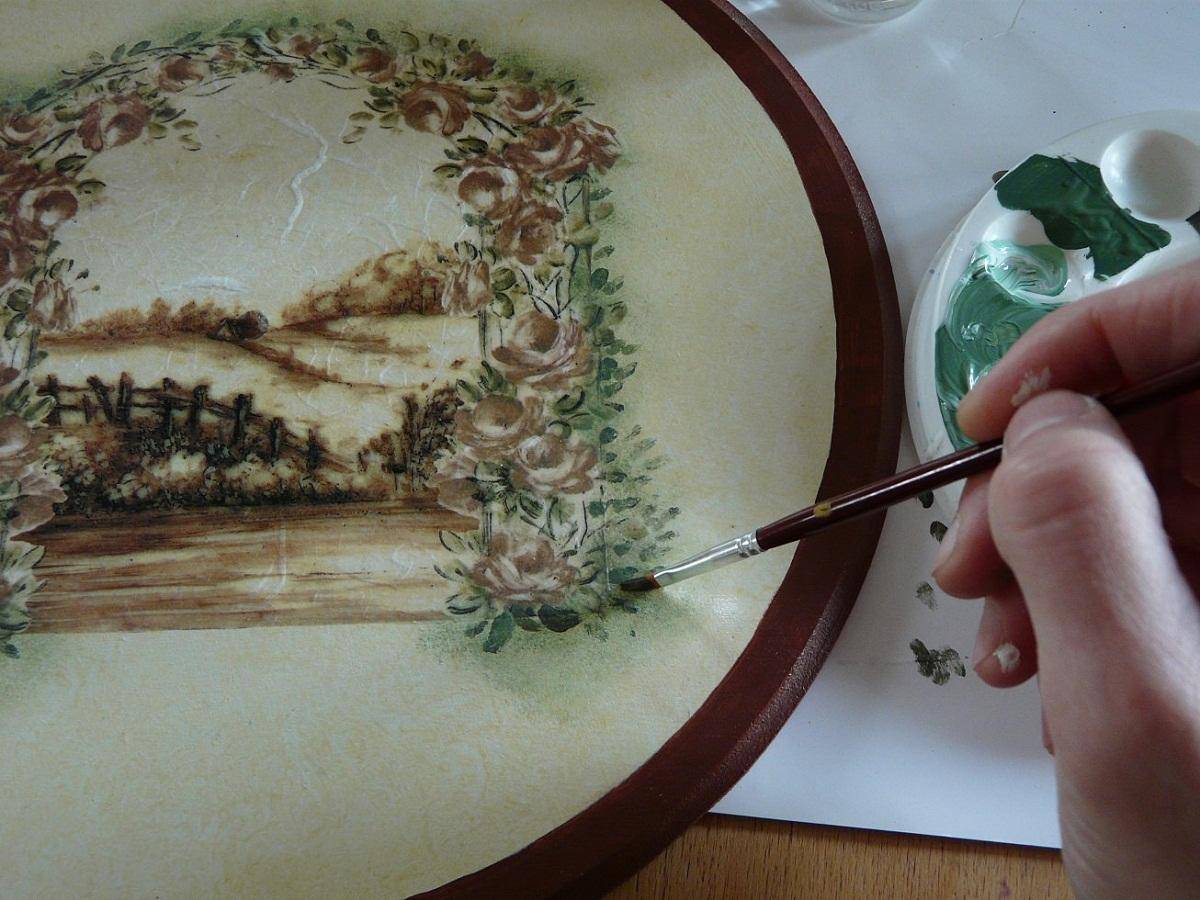 | Декорирование и доработка | Поролоновой губкой наносится фоновая краска и другие оттенки в тон изображению. Кистью прорисовываются мелкие детали. Чтобы добавить некоторой небрежности, можно набрызгать сверху белой краски при помощи щетины зубной щетки. После наносится финальное лаковое покрытие. |