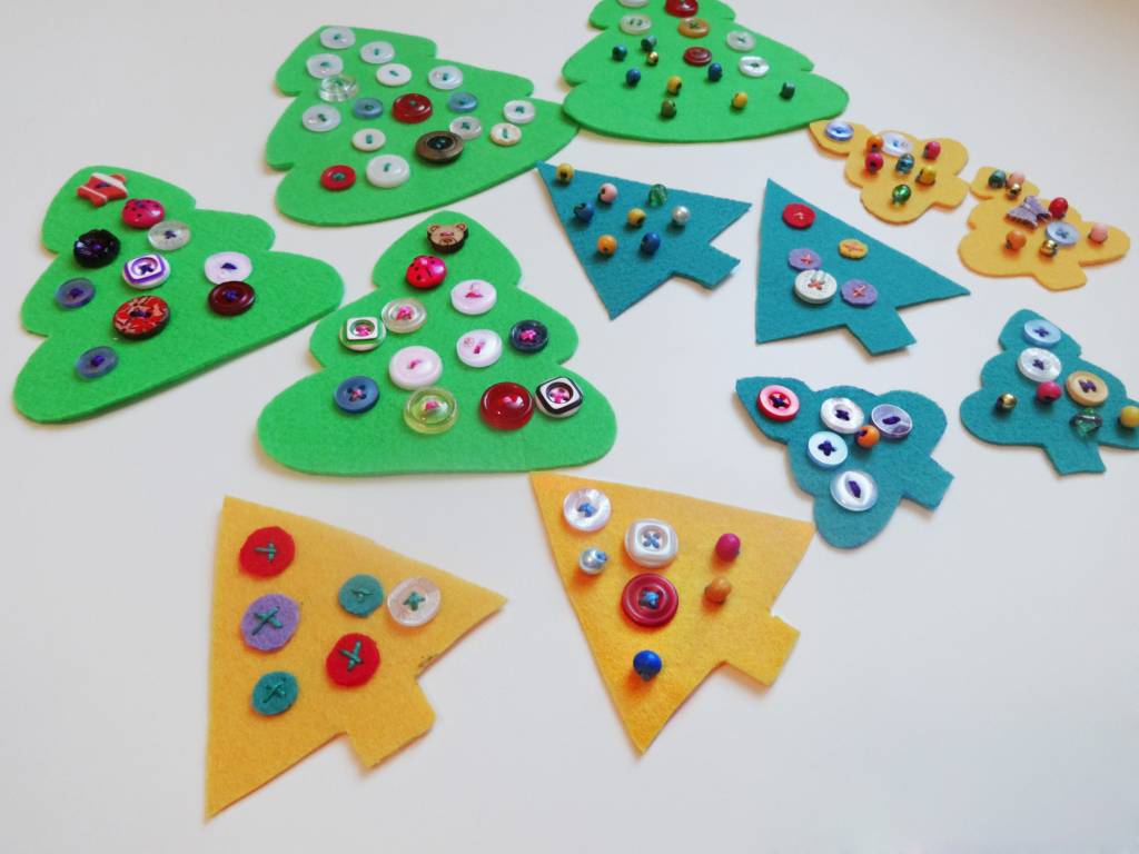Вместо пуговок можно вырезать разноцветные кружочки из фетра. Прикрепите петельки, чтобы за них цеплять игрушки на настоящую елку. Все, готово!
