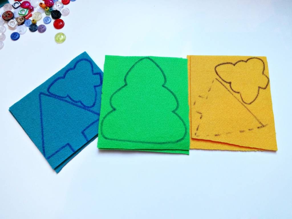 Для одной елочки вырежьте по две детали одинакового цвета. К одной детали пришейте пуговицы. С лицевой стороны аккуратно сшейте обе детали, заполните наполнителем.