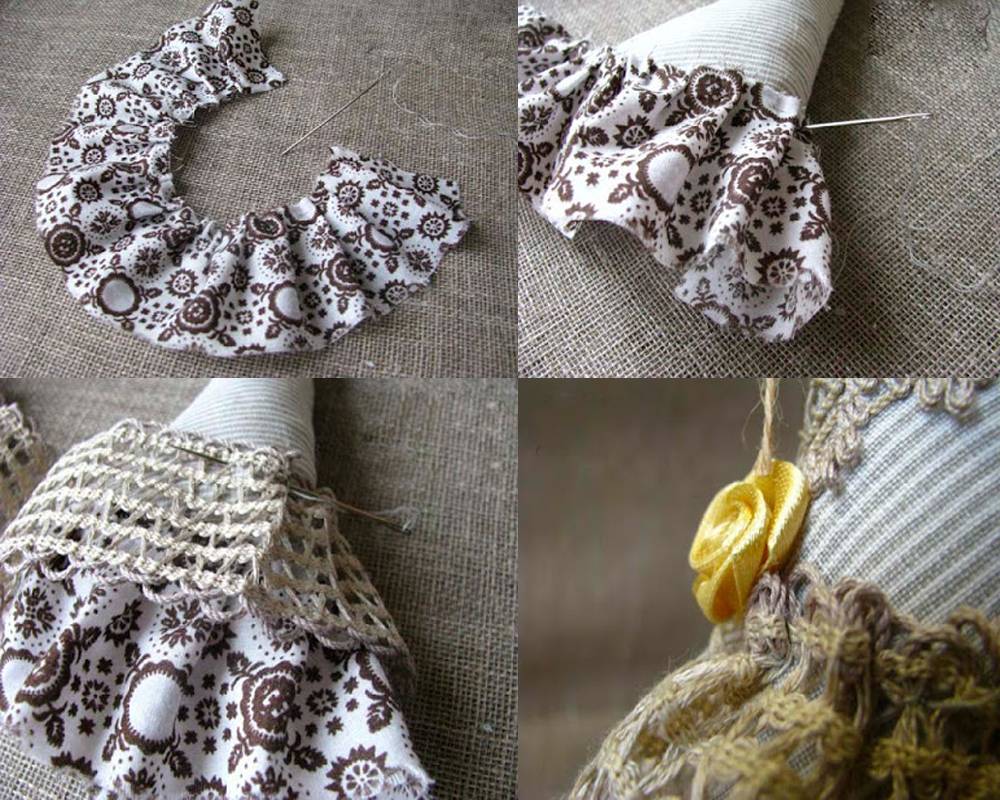 Теперь приступите к декору. Смастерите из ткани и кружева юбочки, собрав один край лоскутка ткани на нитку. Пришейте верхнюю и нижнюю юбки, чуть отступая друг от друга. То же проделайте с бантами и пуговицами. Или же примените термопистолет.