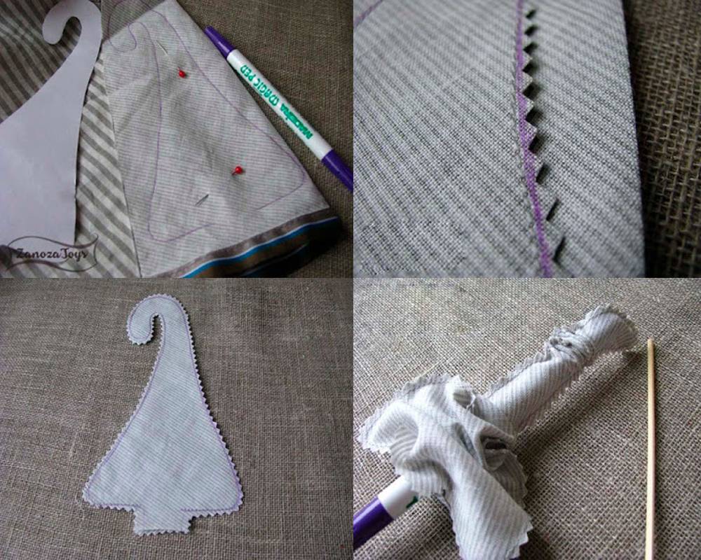 Елку с радиальной симметрией своими руками делают из двух, а лучше из трех одинаковых деталей. Каждую из них прострачивают на машинке, оставляя внизу по 2 отверстия для набивки. Затем выворачивают, складывают в стопочку и прошивают по вертикальной оси. После этого набивают каждую лопасть и зашивают потайным швом.