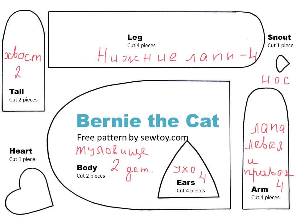 Распечатайте или перерисуйте выкройку игрушки. Распечатав ее на формате А4, получите питомца размером 22*15см. Детали нарисованы без припусков на швы.