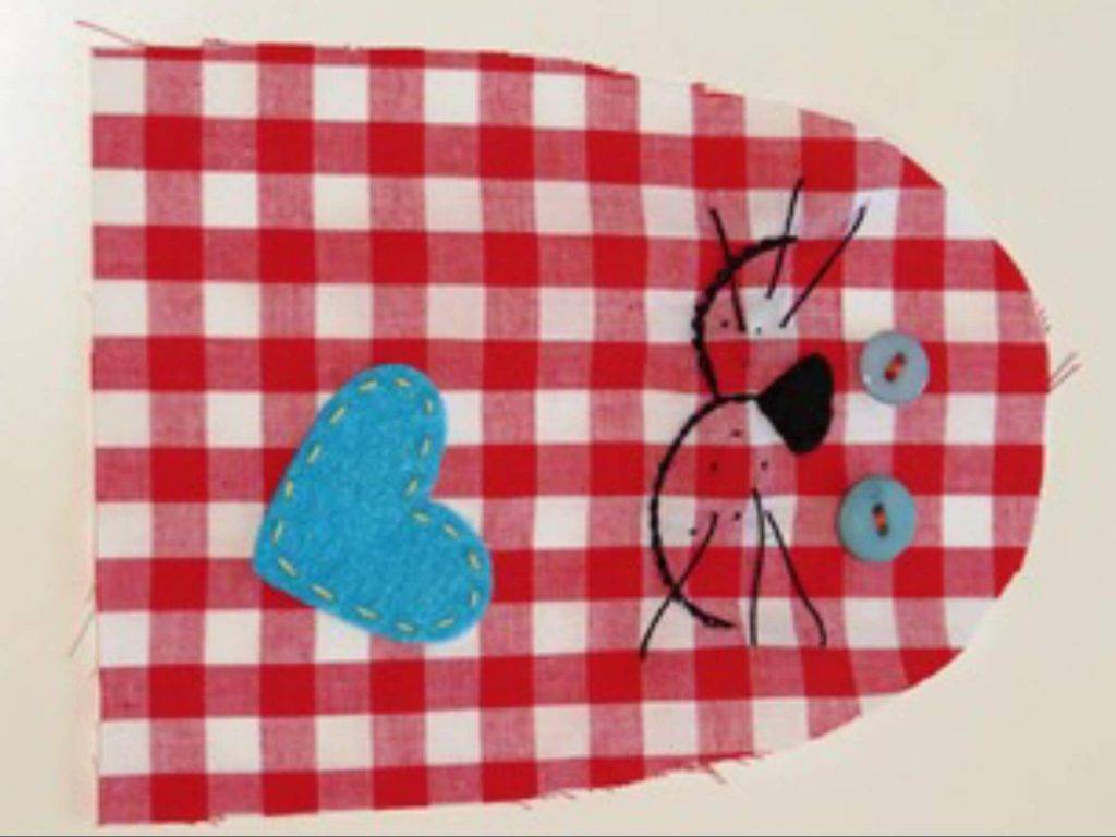 Вышиваем мордочку кота, пришиваем сердечко и глаза-пуговицы. Шьётся нос из фетра. Пришиваем сердечко.