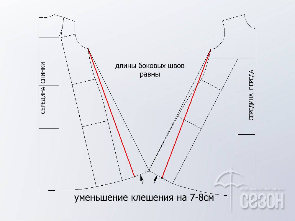 Уменьшаем клёш на 7-8 см для передней и задней деталей, выравниваем низ.