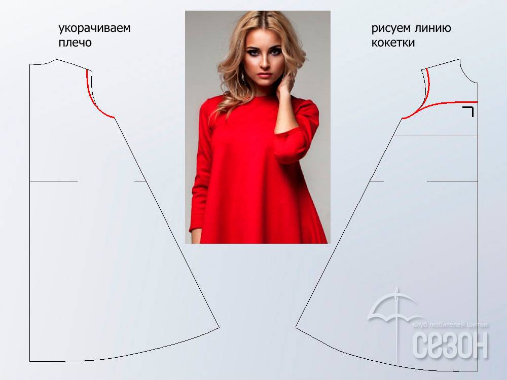Для этой модели расклешение уменьшать не будем. Для построения кокетки уменьшаем плечевой шов на 2 см, оформляем контуры как показано на чертеже. Для рукава используем при моделировании выкройку прямого рукава.