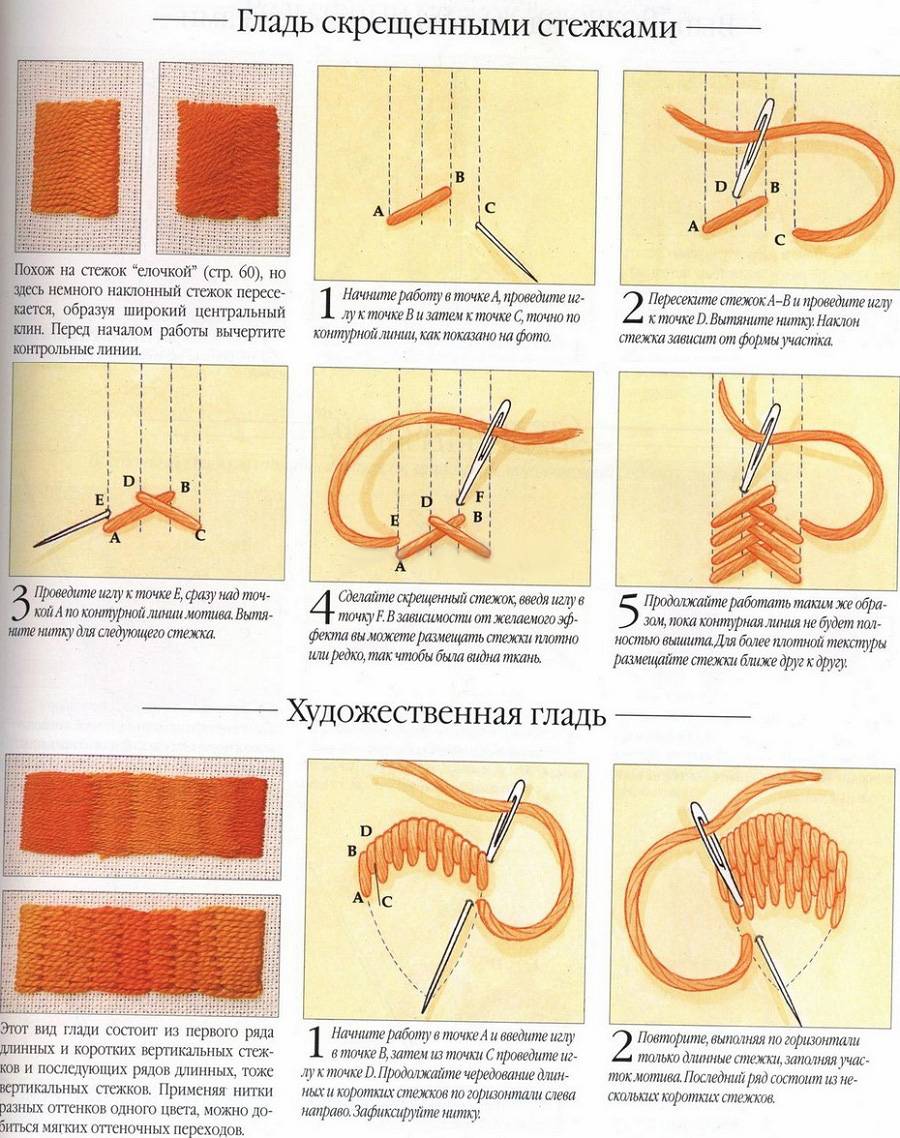 Конкретный совет по вышивке гладью пошагово можно получить только относительно конкретного рисунка. Допускается подходить к процессу творчески. Кому-то нравится вышивать вначале контуры, чтобы рисунок получился более чётким, а потом заполнять его цветами, словно это книжка-раскраска. Кто-то предпочитает контуры выполнять на завершающем этапе. Общий совет: нужно выбирать схему с наименьшим числом элементов, оттачивать на них технику вышивки, а потом прибегать к более сложным вариантам.