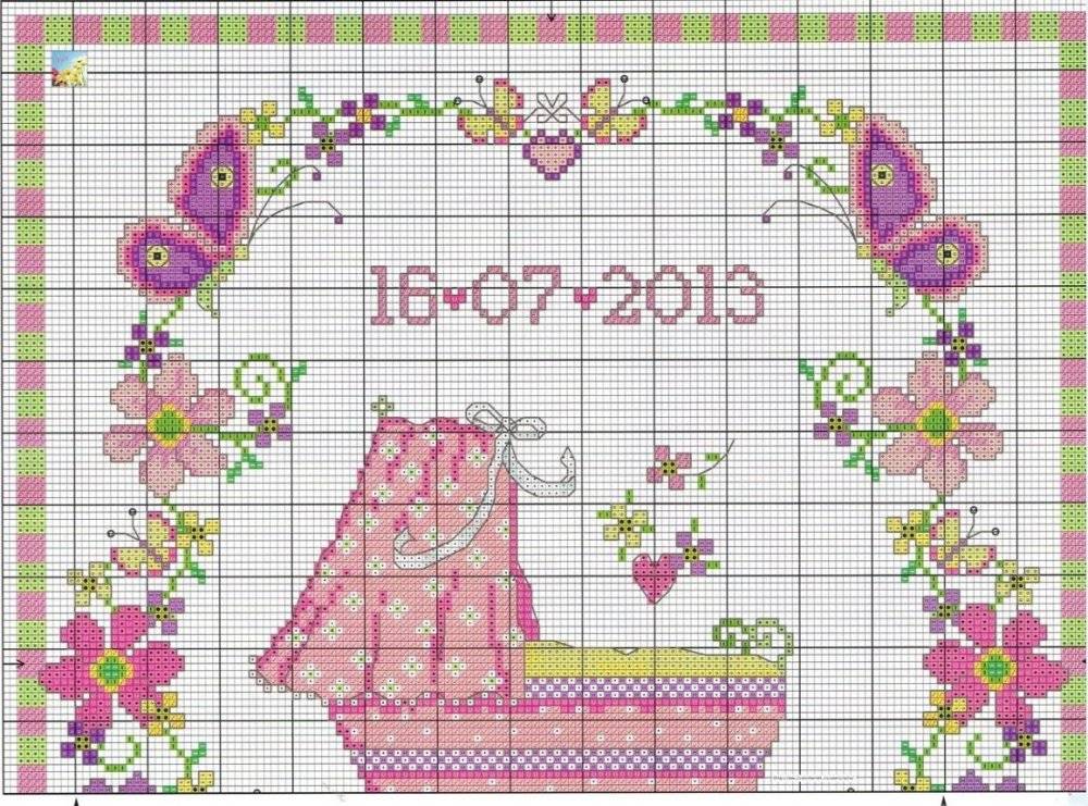 Цвет нитей выбирайте в зависимости от того, кто родится. Для мальчика выбирают голубые, синие, серые цвета, для девочки – розовые, красные тона. Иногда надпись делают универсальным черным цветом, под стиль бэкстича вышиваемого сюжета.