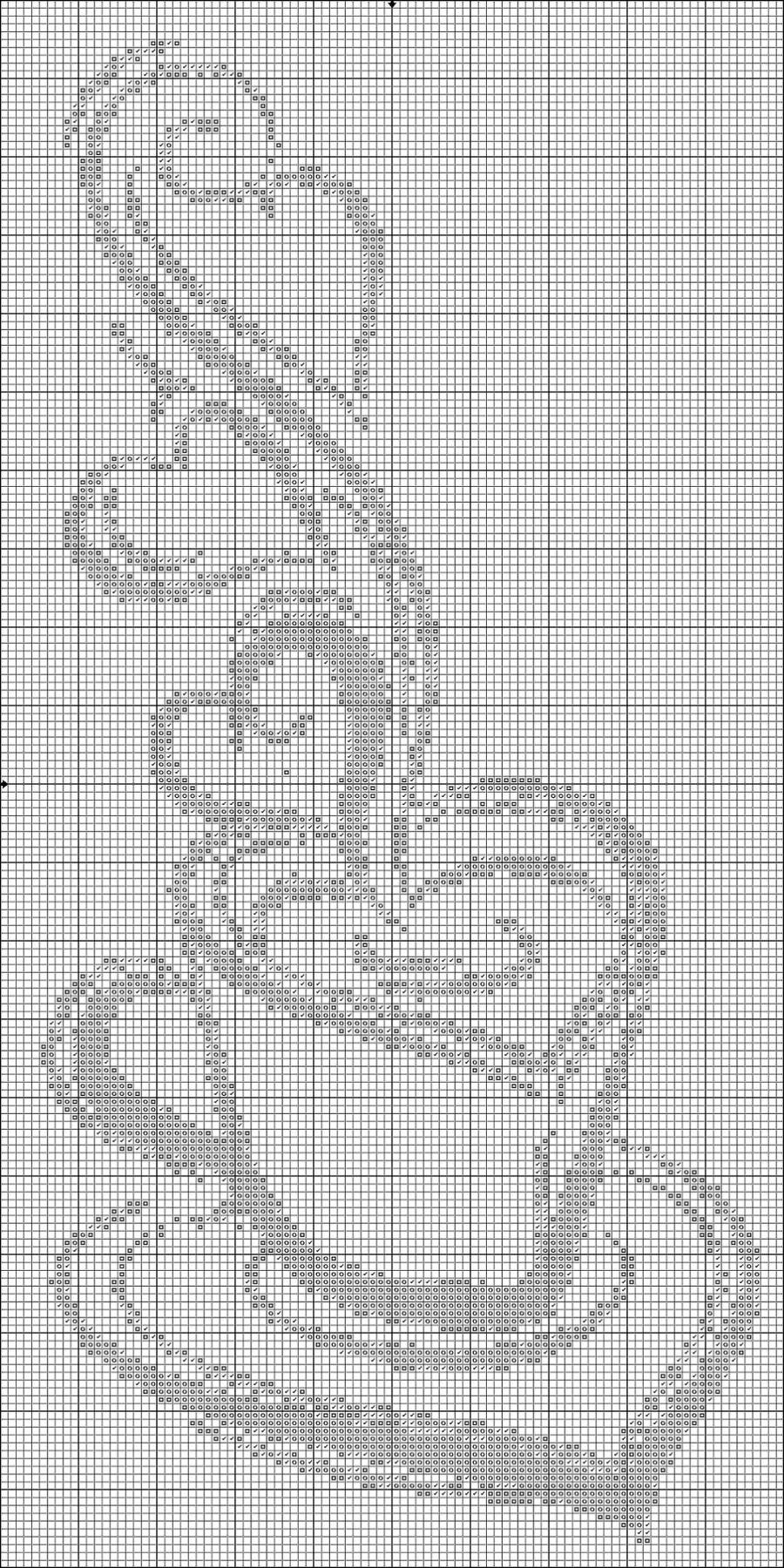 Схема, согласно которой ведется работа черно-белая. Клеточки схемы, в которых нет изображений, не вышиваются. В остальных клеточках схемы есть символы. Каждому символу соответствует определенный цвет нитки. На первый взгляд создается впечатление, что картина вышита одним цветом. Это не так. Вышивка состоит из 3, различающихся буквально в полтона оттенков светло-коричневого цвета.