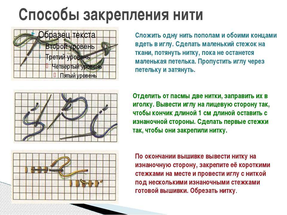 Избегайте узелков. Кончик нити нужно закреплять на изнаночной стороне работы, протягивая их под стежками. Чтобы работа выглядела более аккуратной с изнанки, не нужно оставлять слишком длинные концы ниток и делать узелки, это может негативно сказаться на лицевой стороне работы. Если нитка закончилась, то ее кончик тоже нужно закрепить под другими стежками, как и в начале работы.