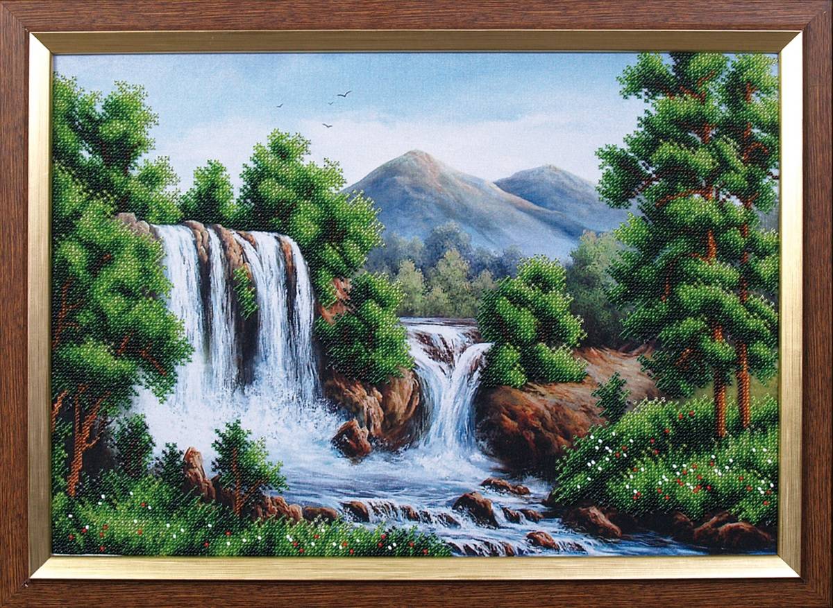 Схема пейзажа с водопадом подойдет для опытных мастериц. С помощью своих умений они смогут передать движение воды.