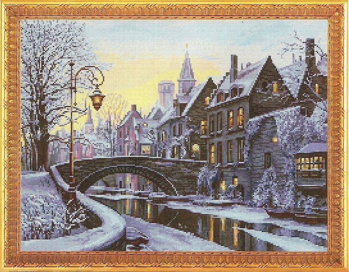 Так же как и в других работах, при вышивке зимних пейзажей используется полный крест. Для создания контрастных оттенков лучше работать с подложкой. Особо гармонично смотрятся зимние пейзажи с интерьером, оформленным голубых тонах.