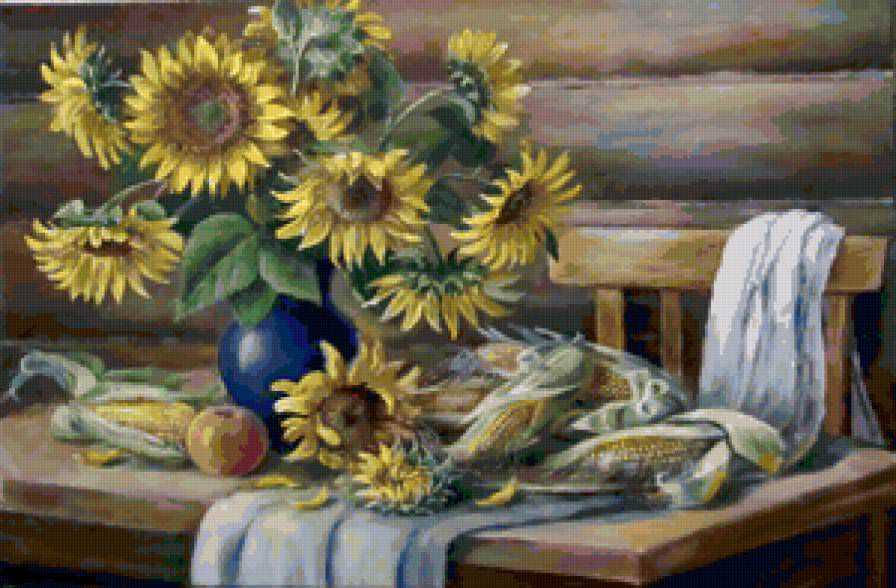 Работа, которую предстоит выполнить, увлекательная и красивая. Помимо подсолнуха на ней красуются початки кукурузы. Схема поможет разобраться с различными оттенками красок, с игрой света и тени. Вышивка крестом подразумевает проработку всех деталей. По окончании работы кукуруза и упавшие лепестки подсолнуха заиграют яркими красками.