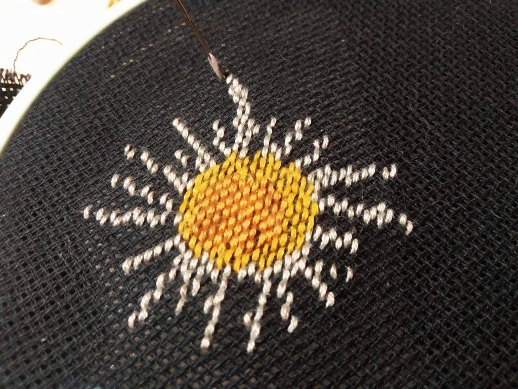Повторяют прямой стежок по кругу, после чего переходят к выполнению серединки цветка. Для неё используют жёлтый цвет. Ею тоже делают стежки с завитком.