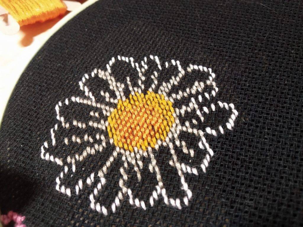 Вышивка ромашки на фотографиях выполняется полукрестом четырьмя цветами мулине: желтые и оранжевые нитки для сердцевины, белые и серые для лепестков цветка.