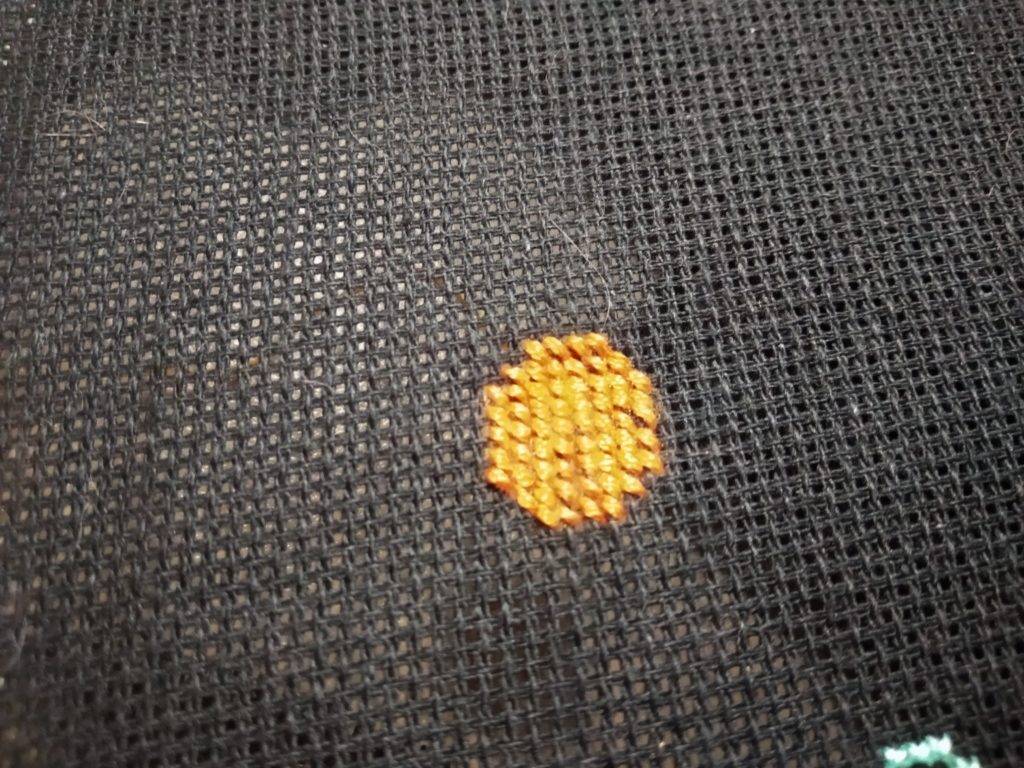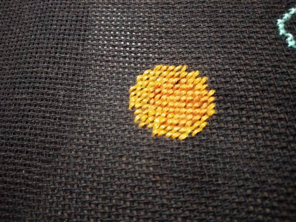 Если у вас это не получается, как альтернативу используйте толстую шерстяную нитку того же цвета и попросту зашить серединку. Если у вас есть опыт и вы хотите сделать её объёмной, можно оформить середину французскими узелками. Делают узелки по простому принципу – иголку прокручивают вокруг три раза и протягивают через канву. В конечном итоге получается аккуратный узелок.