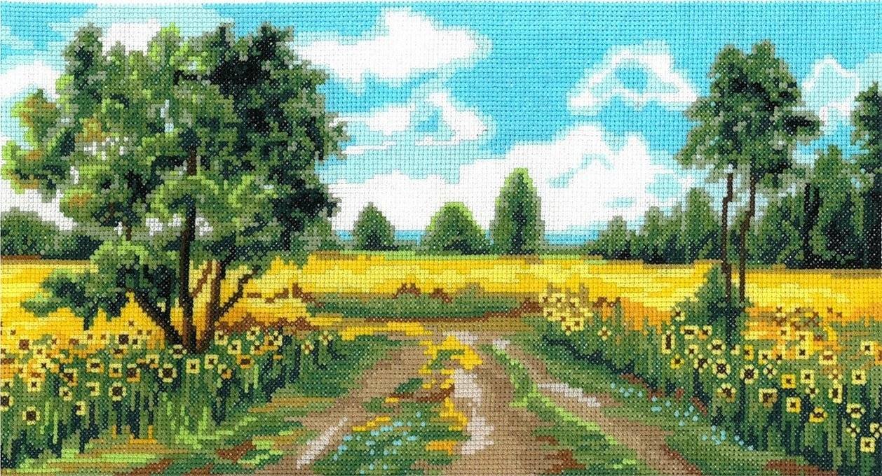 Лесной и сельский пейзаж особо любим молодыми рукодельницами. Для вышивания выбирается несложная схема, цветовая гамма включает основные цвета без трудных переходов. Летние пейзажи сельской местности радуют своим разнообразием луговых трав, цветов, белыми березами и яркими насыщенными красками.