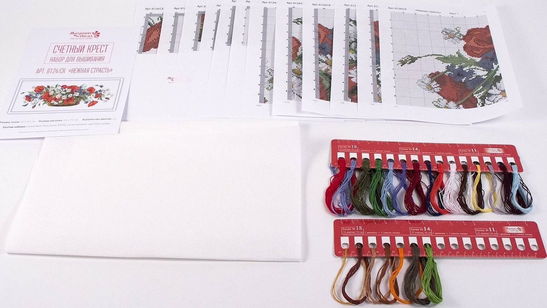 В набор входят уже подобранные цвета нитей, что значительно упрощает работу. Однако вышивку следует выполнять в правильном порядке, желательно по квадратам, чтобы не сбиться с подсчета и распределения крестиков.